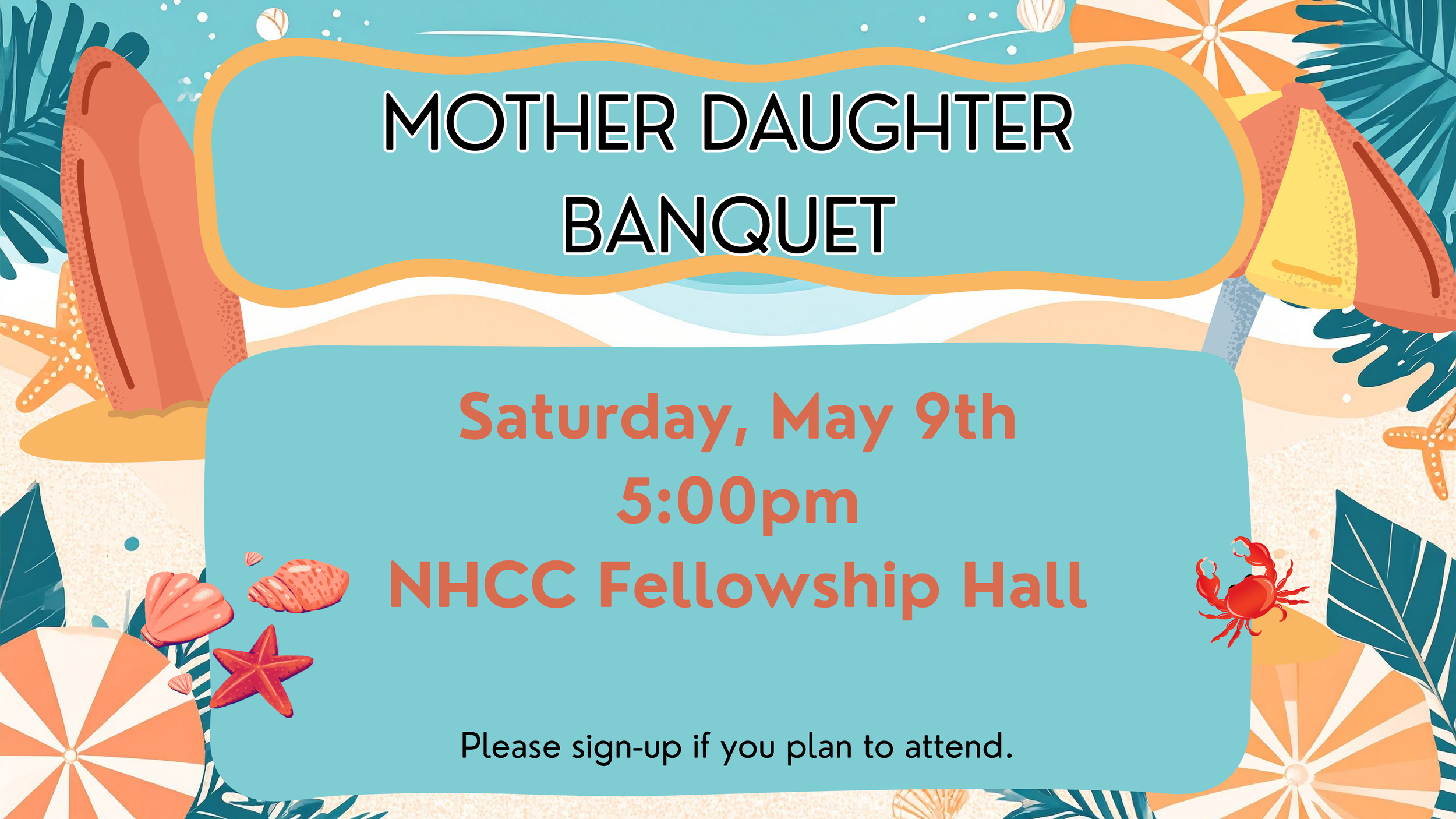 All ladies are invited to join us on Saturday, May 9th at 5:00pm for our Mother Daughter Banquet. We ask that everyone please sign-up below or in the hallway at NHCC so we can plan accordingly. If you have any questions, please contact the church office at