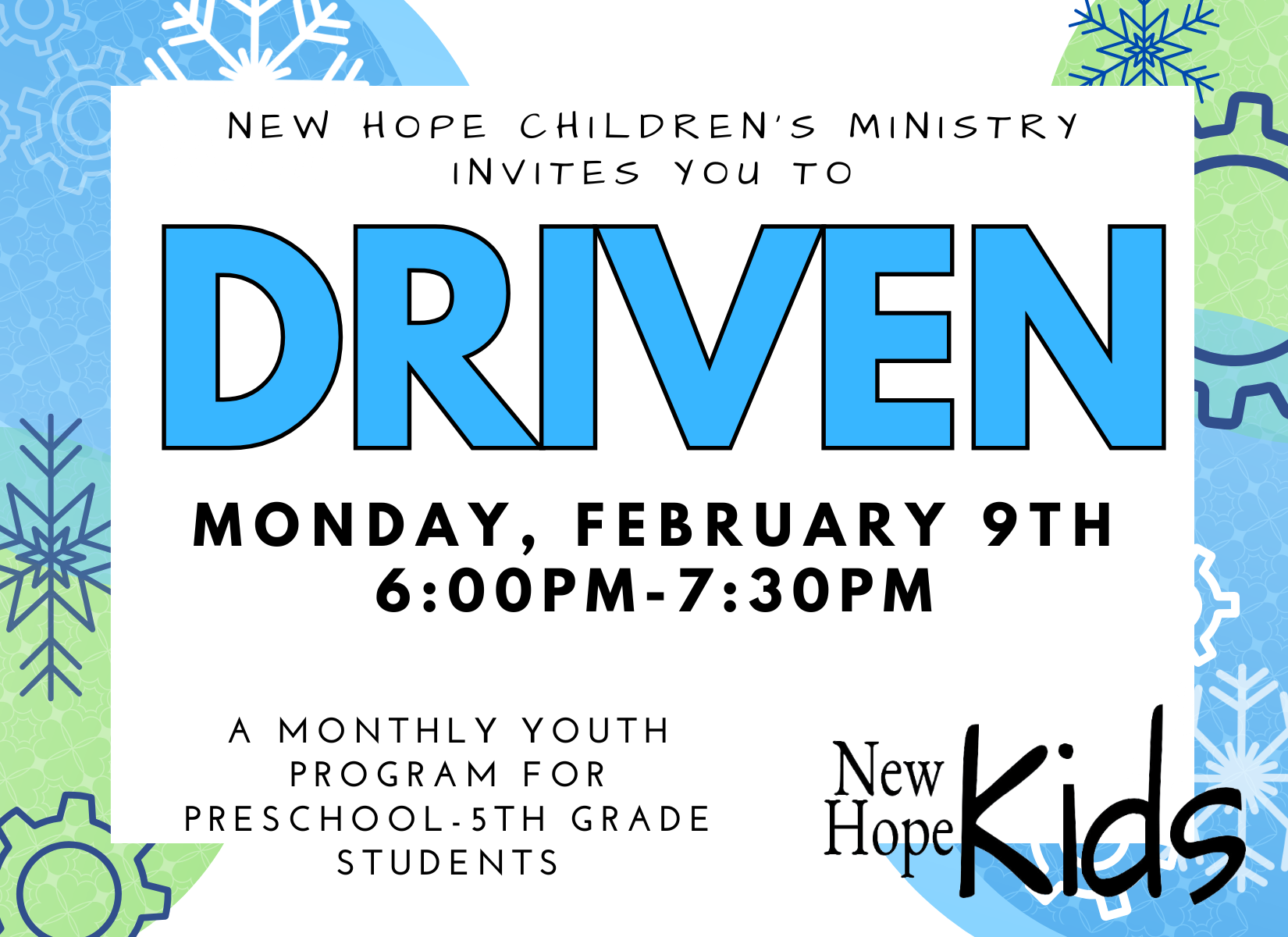 Driven is a program for youth in Preschool through the 5th grade students. This event takes place on the second Monday of the month.