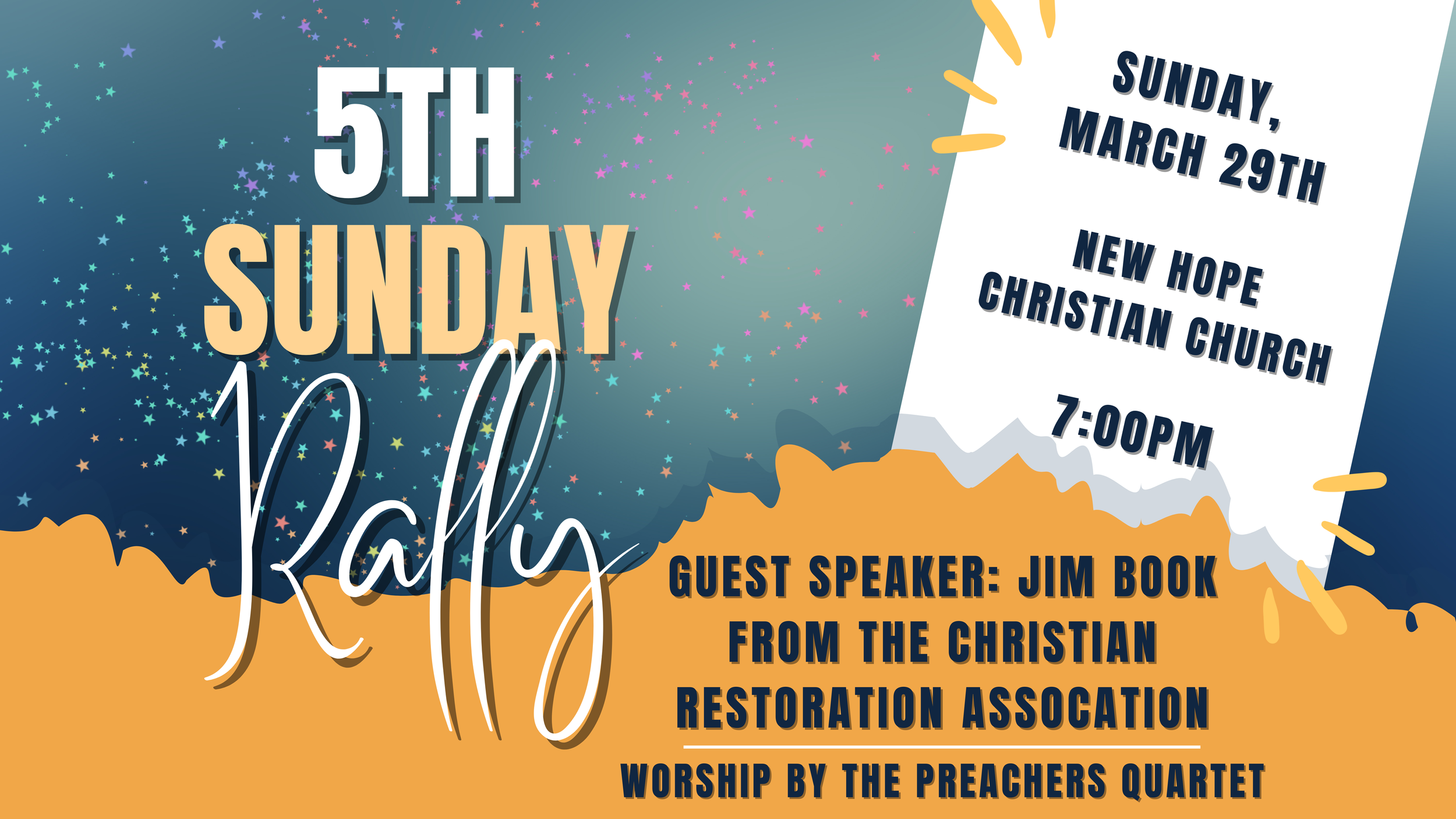 We’re excited to share that the March 5th Sunday Rally will be hosted right here at New Hope Christian Church on Sunday, March 29th at 7:00pm!